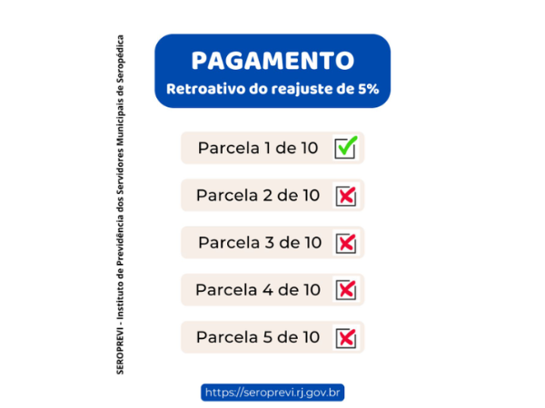 A Prefeitura definiu o pagamento do retroativo em 10 parcelas mensais, e seguimos o mesmo cronograma.